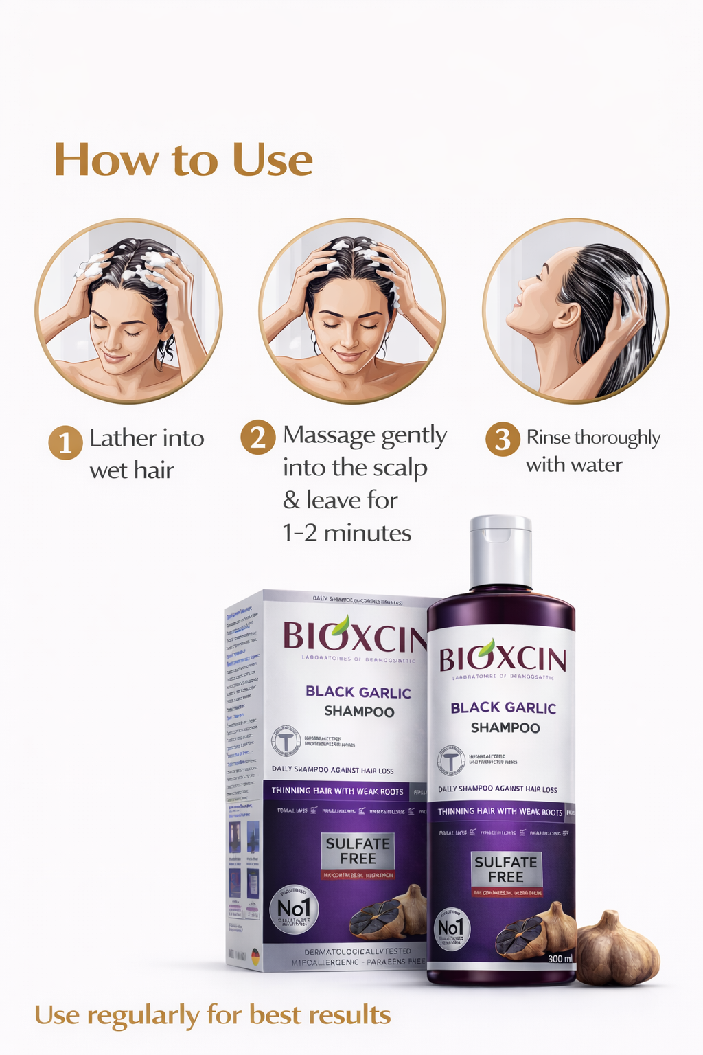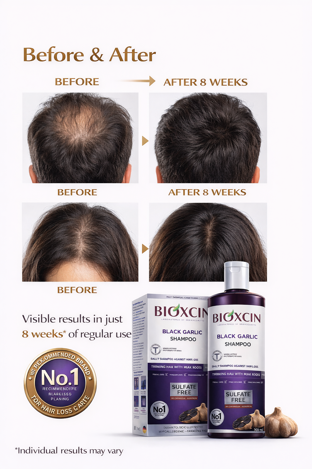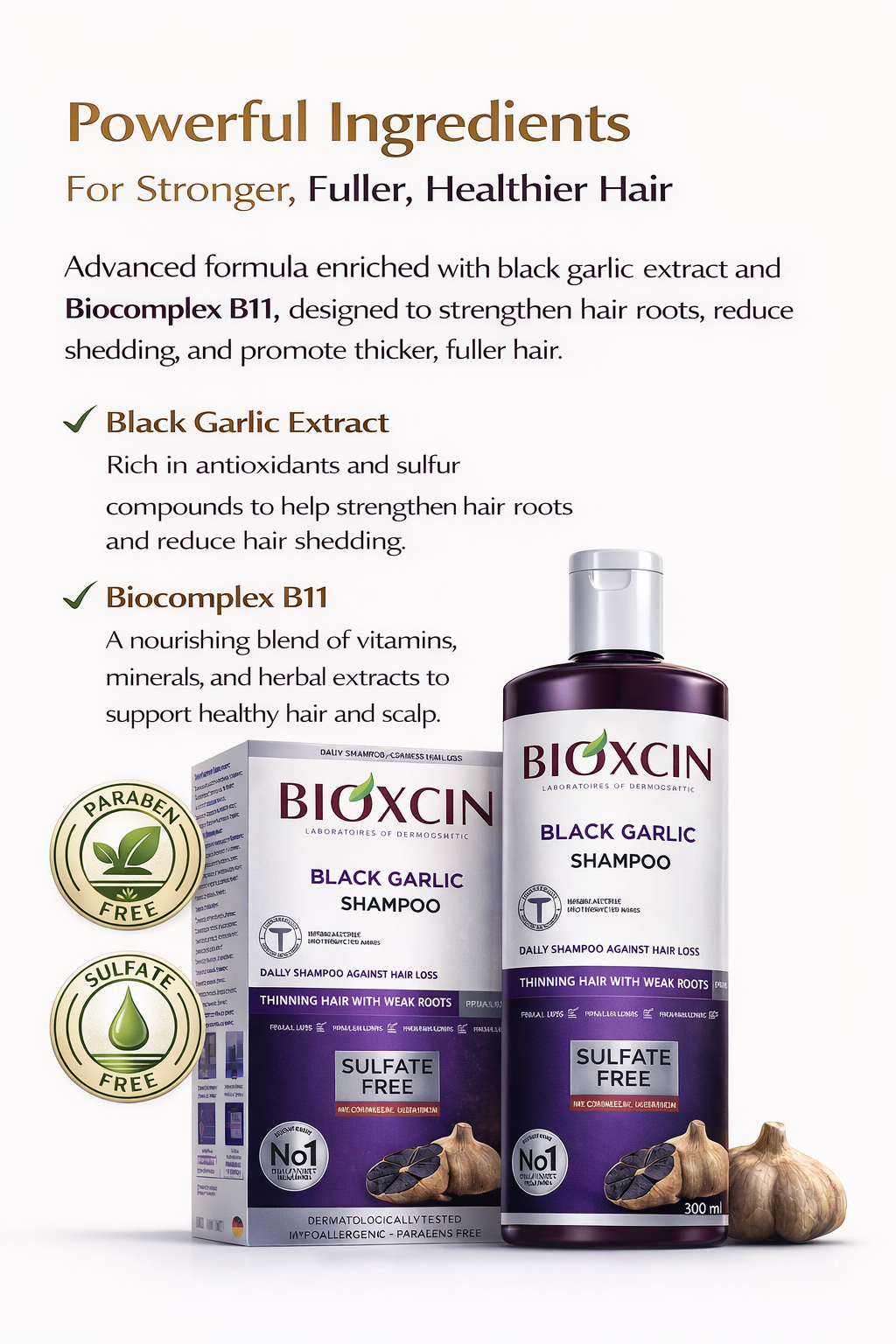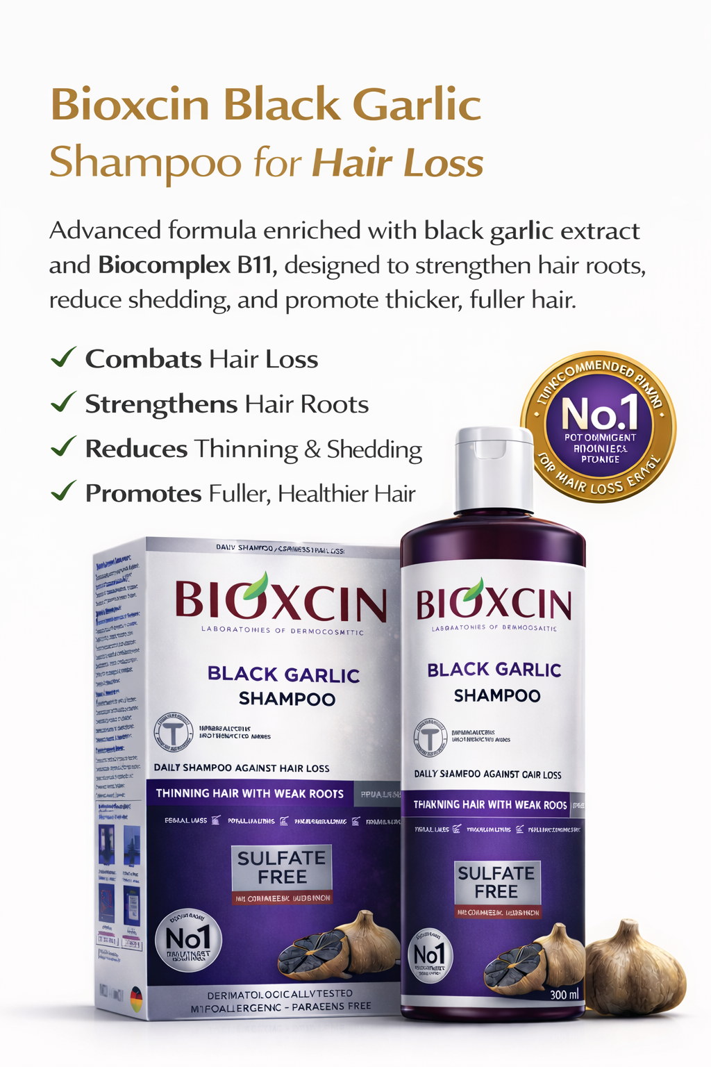 Bioxcin Black Garlic Shampoo is specially formulated for individuals experiencing hair thinning and excessive shedding. Powered by Black Garlic Extract and the patented Biocomplex B11, this advanced dermocosmetic shampoo helps fortify hair roots, improve scalp health, and promote visibly stronger, fuller hair.