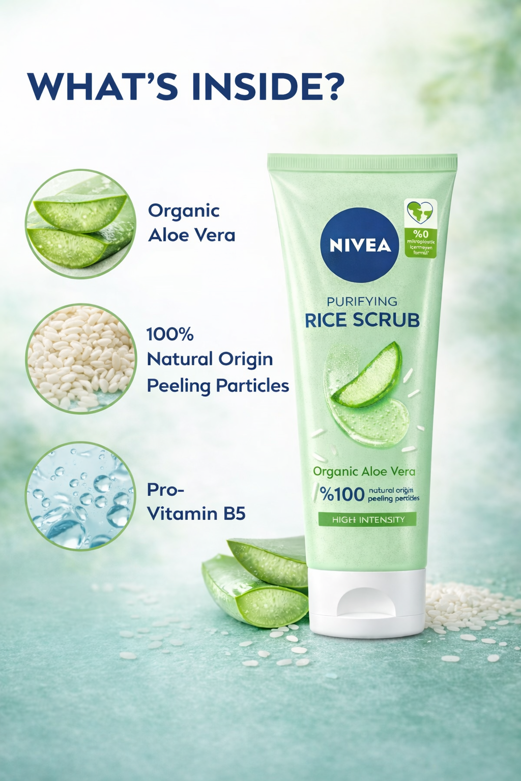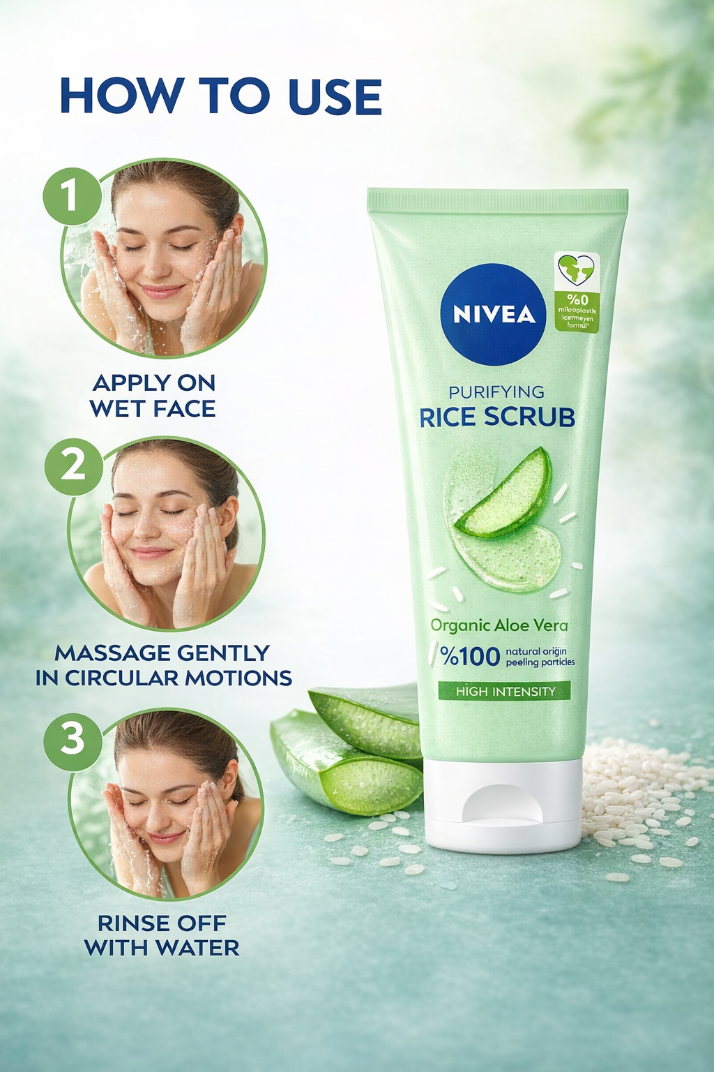 NIVEA Purifying Rice Facial Scrub with Organic Aloe Vera gently exfoliates the skin while effectively removing impurities, excess oil, and dead skin cells. Formulated with 100% natural-origin exfoliating rice particles, this scrub helps to deeply cleanse pores without irritating the skin.