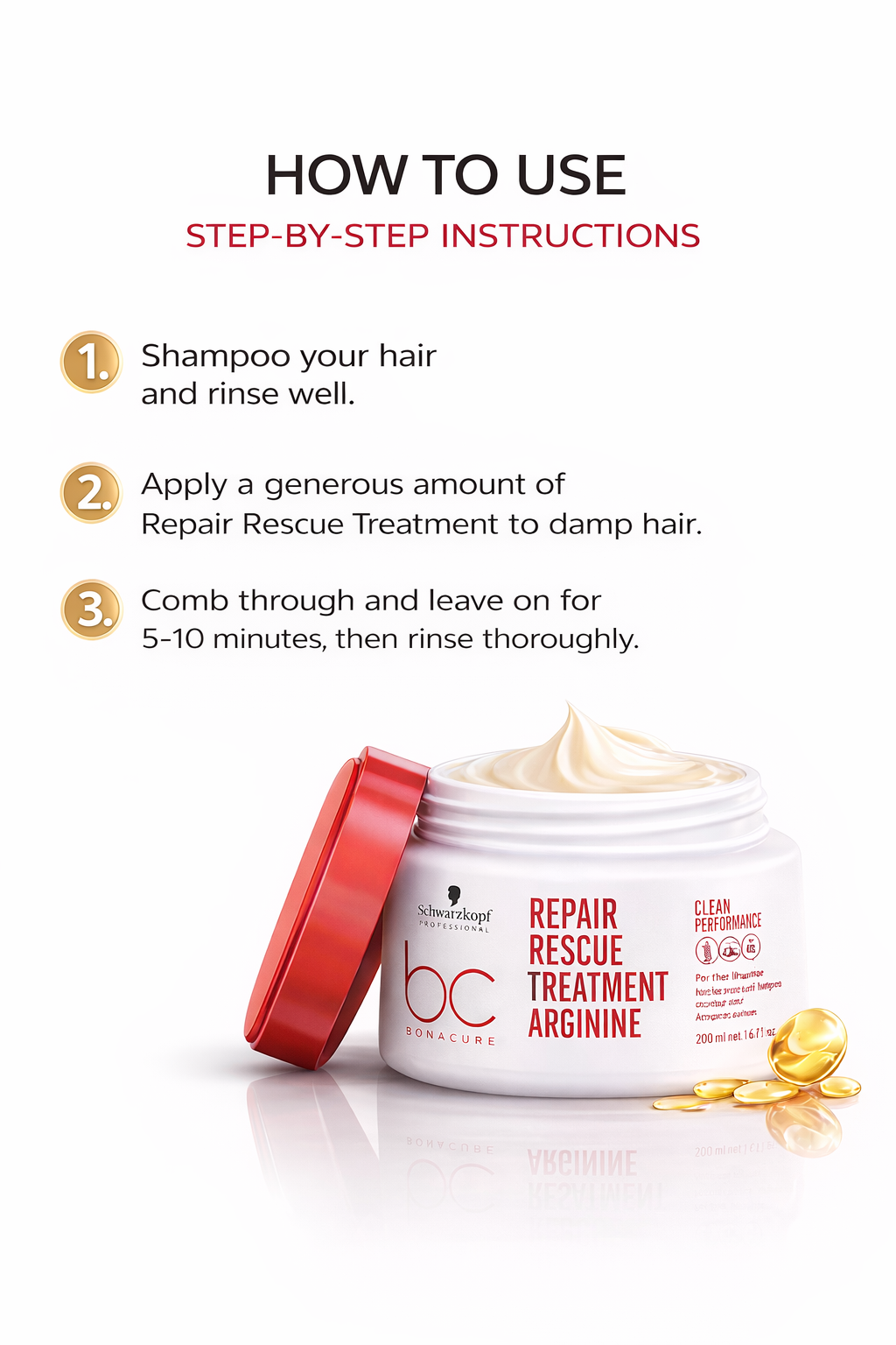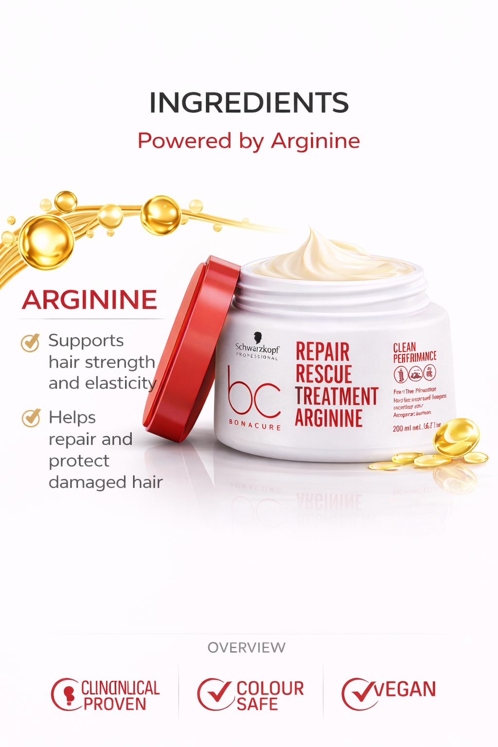 Arginine supports the hair’s natural protein structure and helps restore inner strength, making hair more resistant to future damage while improving shine and softness.